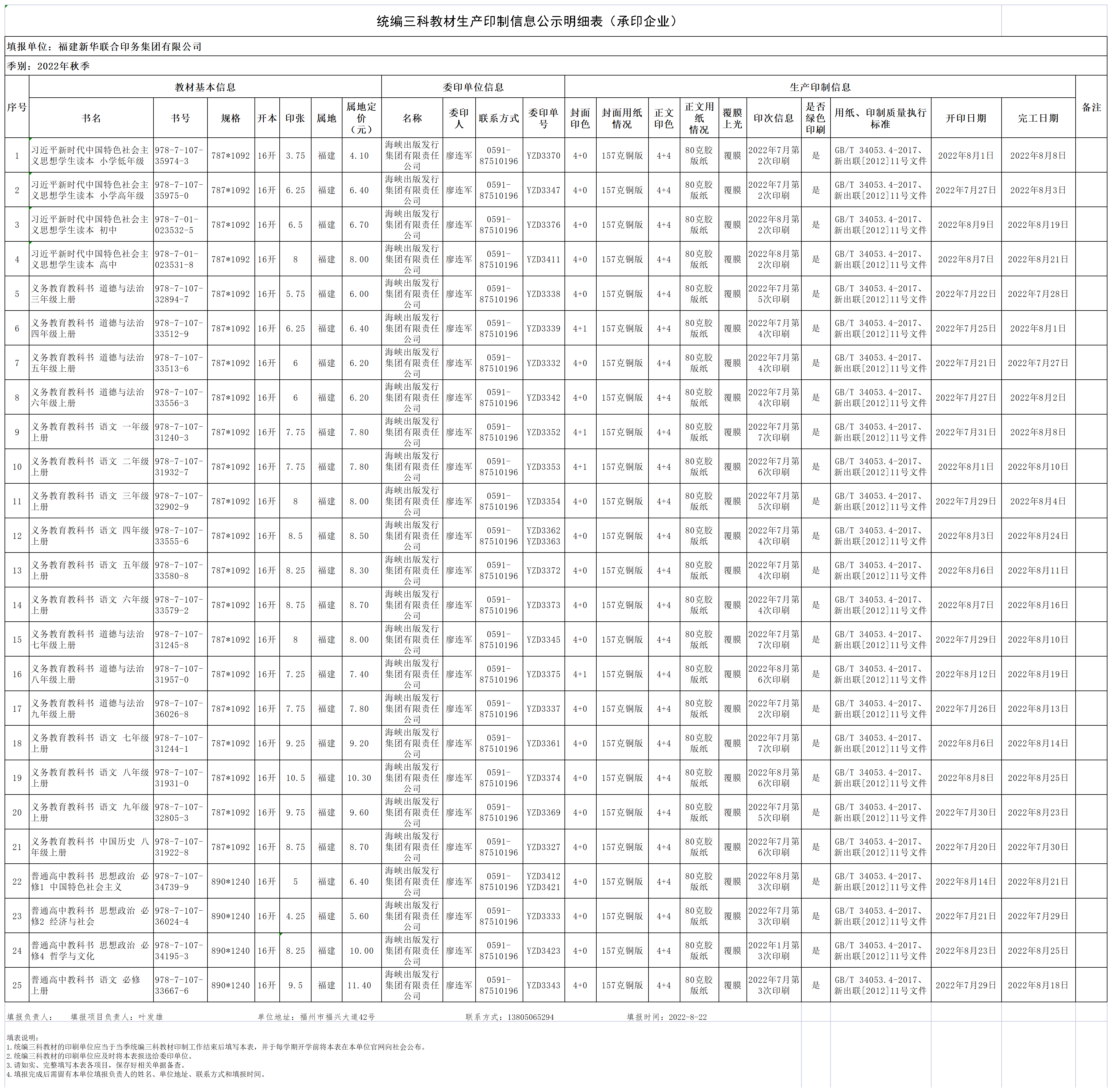 2022年秋季统编三科教材生产印制信息公示明细表