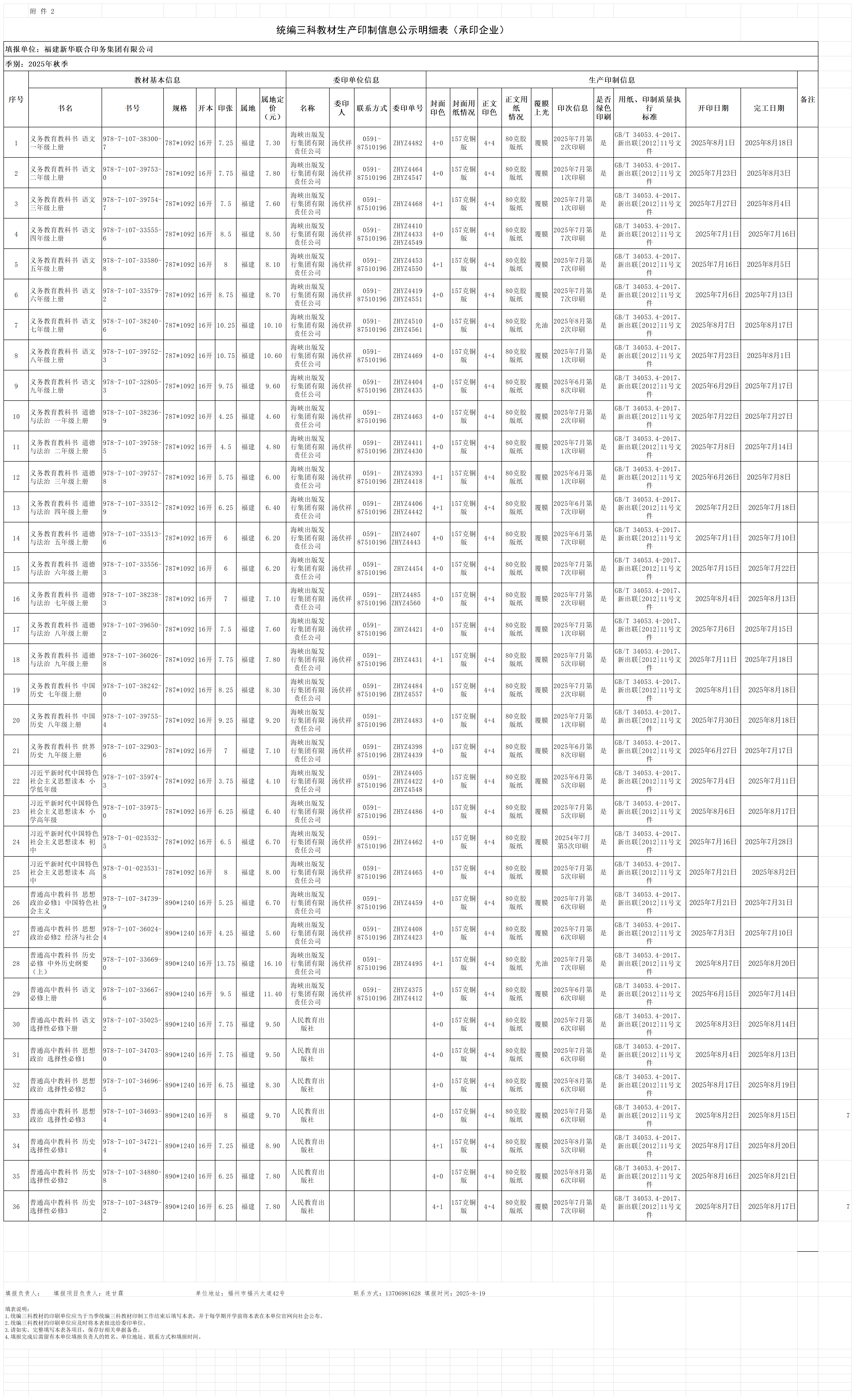 2025秋联合印务统编三科教材生产印制信息明细表