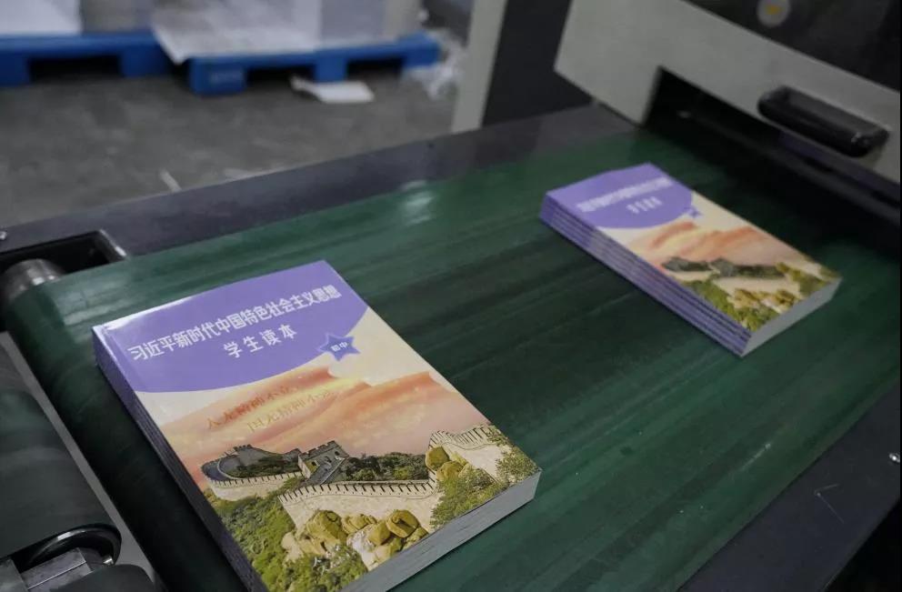 与此同时,在面对《读本》及统编三科教材双重印制任务,为确保高标准、高质量印制,印务集团对印刷全流程进行管控,严格把关各工艺环节。在印前制作环节上,全面落实对蓝纸样的三校规定,严格执行三校对稿检查制度;在印刷环节上,引进色彩管理系统,精细化做好墨色控制,提升印品档次;在装订环节上,加装了条码检测、称重检测设备,坚持不间断、全品种进行拉力检测,坚持使用绿色环保优质的热熔胶,严防散书、掉页等情况发生;在打包环节上,每包成品上下加装两张加厚楞纸,调节适当的打包带松紧度,最大程度保护成品外观。