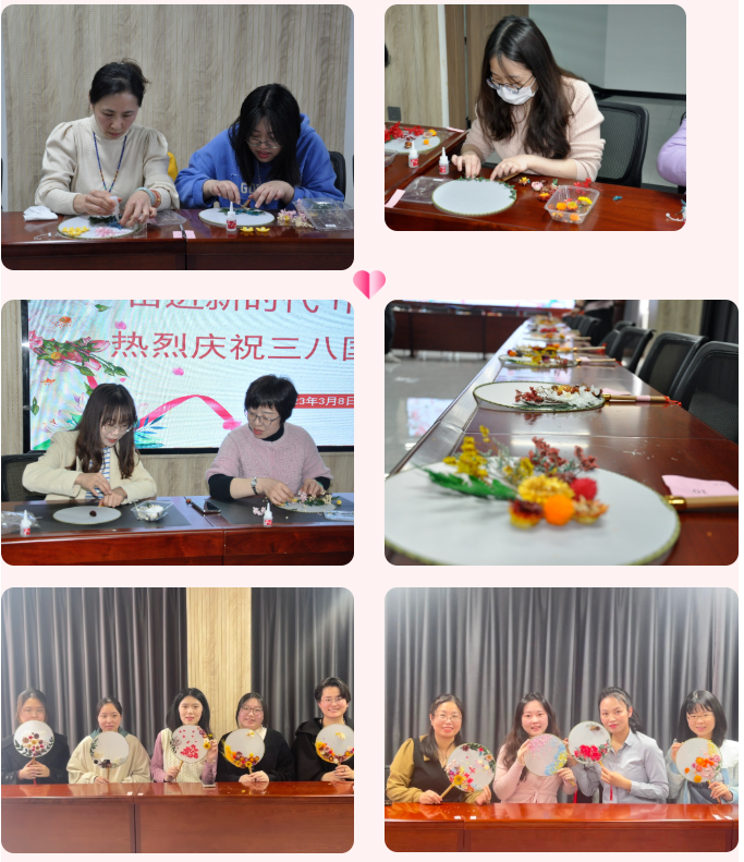 手工团扇DIY创作环节开始啦,大家怀着激动而又跃跃欲试的心情,拿起手中的干花在空白扇面上左摆右放,然后开始从构图、色彩方面进行造型设计、粘贴制作,不多会儿一把把独具匠心,美不胜收的团扇呈现在众人的眼前。