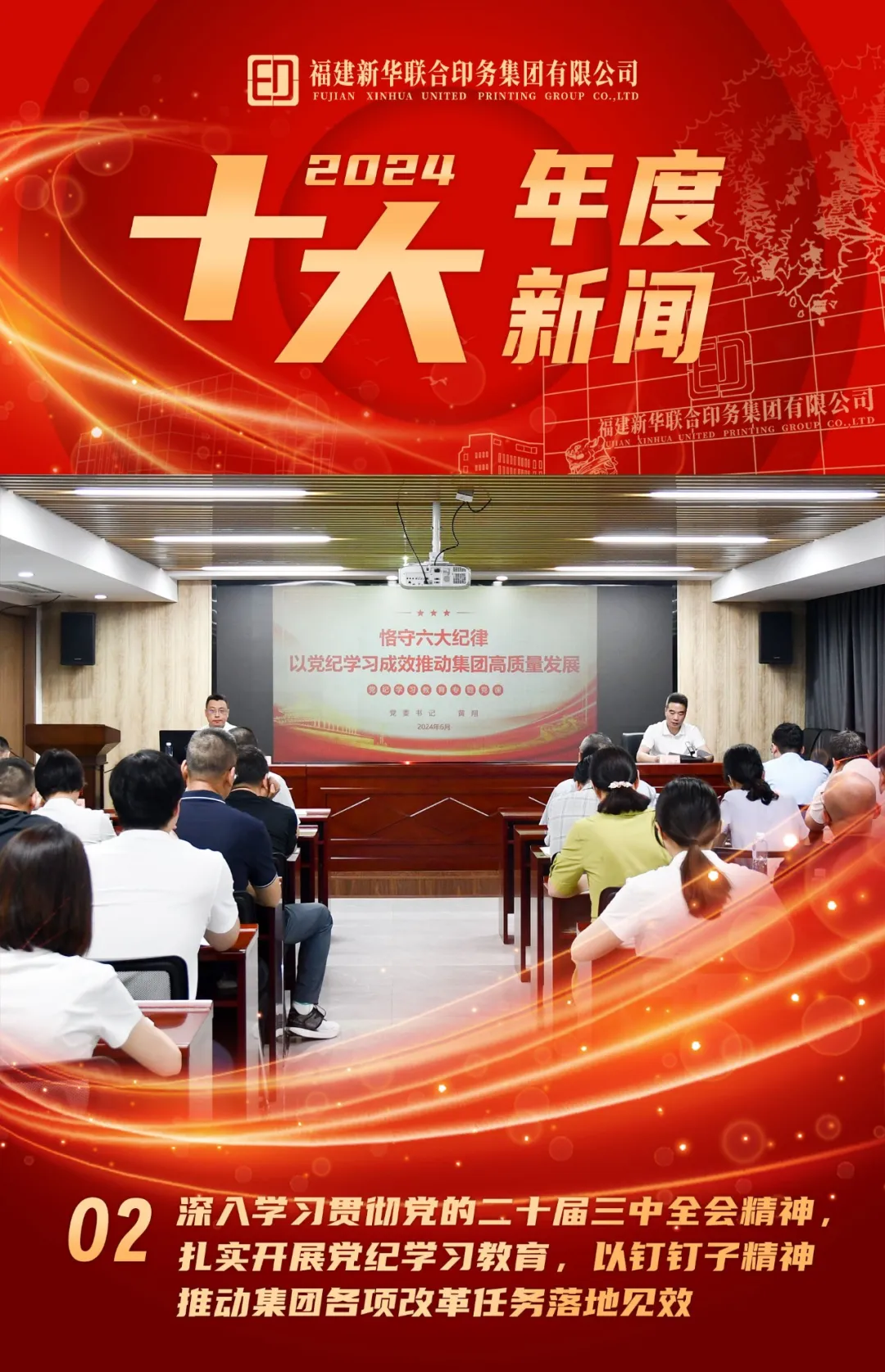 2024年,集团党委紧扣深入学习宣传贯彻党的二十届三中全会精神这一主线,将其列为党委会“第一议题”、领导班子成员履职“第一课”、理论学习中心组“第一专题”、支部“第一党课”、各级各类培训“第一重点”;创新采取专题学习、集体讨论、党支部联学、“微党课”等形式进行深学细悟,围绕推进中国式现代化、深化改革开放、实现高质量发展、发展新质生产力等方面,找准贯彻落实全会精神的切入点、结合点、关键点,牢牢把握高质量发展首要任务,制定细化集团全面深化改革任务清单,推动改革任务落地落实,切实将印刷产业优势转化为因地制宜发展新质生产力的澎湃动能。扎实开展党纪学习教育,通过开展典型案例通报、召开警示教育大会、举办《条例》学习专题辅导报告会、党组织书记讲纪律专题党课,丰富学习形式、强化以训促学,引导党员干部时刻绷紧纪律这根弦,切实把遵规守纪内化于心、外化于行,把党纪学习教育成果持续转化为推动高质量发展的强大动力。