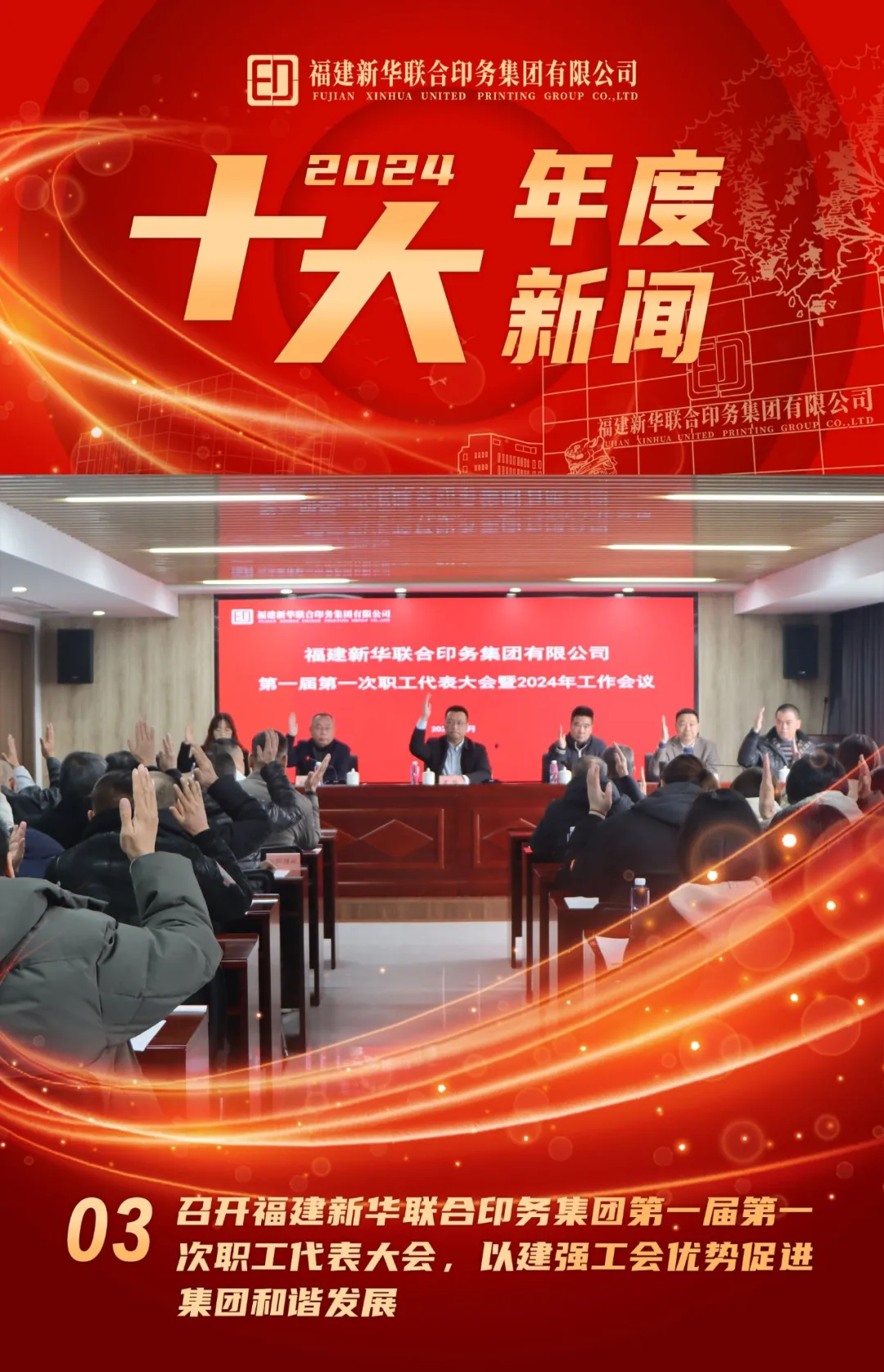 2024年2月29日,集团顺利召开第一届第一次职工代表大会。会议以习近平新时代中国特色社会主义思想为指导,深入学习贯彻党的二十大和二十届二中全会精神,全面落实海峡出版发行集团党委部署要求,总结2023年工作、部署2024年任务。大会的召开是集团全面落实全心全意依靠职工强企,进一步发挥工会推进企业深化改革,促进企业健康和谐发展的一项重大举措。成立后的集团工会,始终坚持围绕中心、服务大局,认真履行工会职能,以建设职工满意的模范职工之家为目标,以全心全意服务职工为根本宗旨,积极参与集团民主建设,充分发挥好桥梁纽带作用。精心组织开展庆祝建国75周年爱国诗文经典诵读、职工春秋游等活动,职工企业文化生活持续丰富,职工凝心聚力、团结奋进、积极向上的精神面貌持续展现。