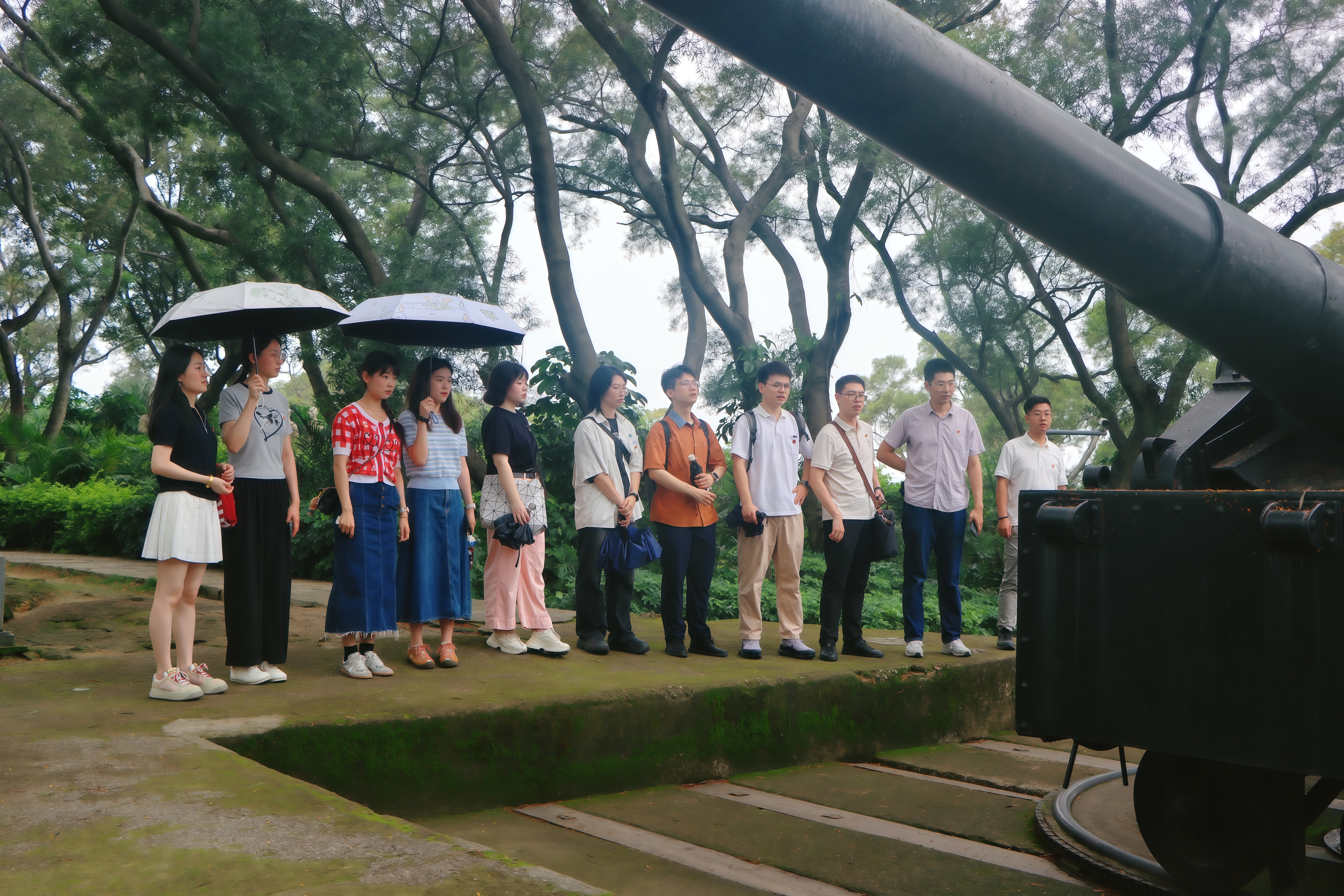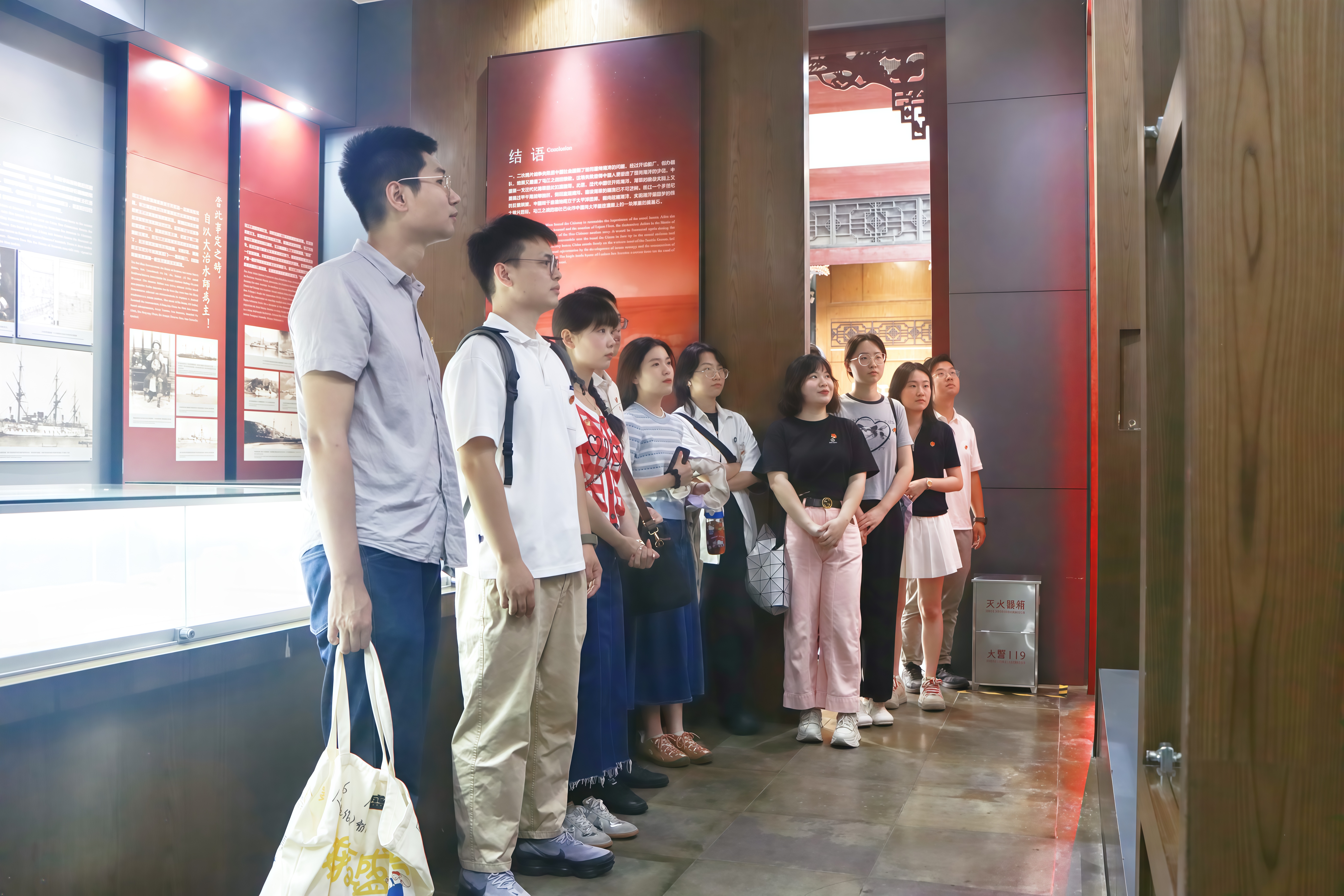 马尾船政作为中国近代工业与海军的摇篮,承载着“自强求富”的民族精神。活动当天,青年团员们集结于昭忠祠前拍摄合照留念;随后,双方共同参观了马江海战纪念馆,透过锈迹斑斑的炮台、泛黄的历史图卷,重温1884年中法马江海战的悲壮史诗。青年们驻足于中坡炮台、英国领事分馆旧址间,触摸船政学堂“师夷长技以自强”的历史脉络,感受“向海图存”的近代化探索与当今“海洋强国”使命的时空共鸣。