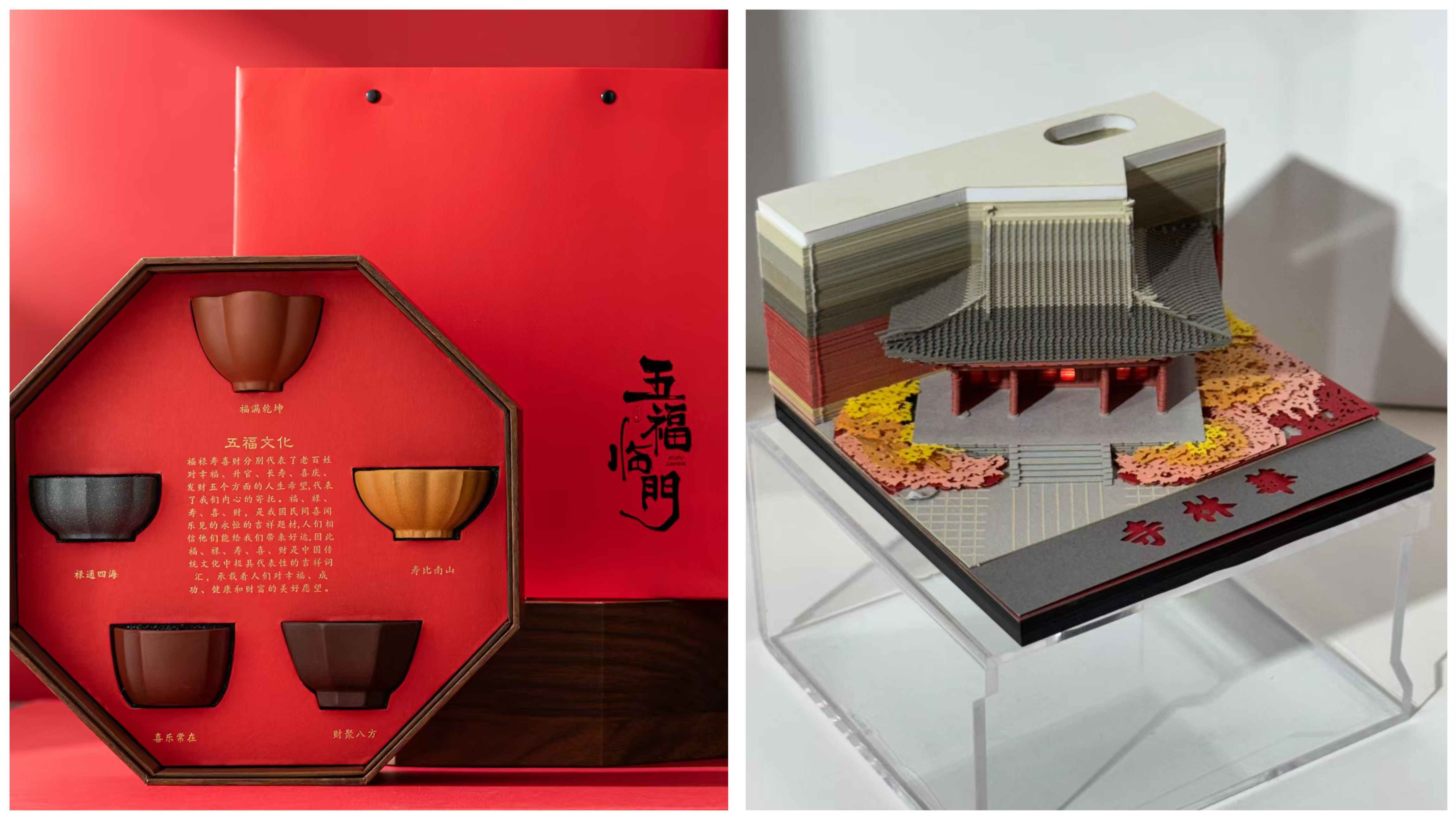 获奖作品兼具文化内涵与实用价值,彰显国潮设计新风尚。其中“五星出东方”陶瓷茶具灵感源自汉代国家一级文物“五星出东方利中国”蜀锦护臂,融合五色釉彩、祥禽瑞兽的吉祥寓意,器型简约、釉色温润,既延续了中式茶器的典雅底蕴,又贴合当代消费者审美需求;而“华林寺3D便签”则将福州古建精华凝练于方寸之间,立体还原了华林寺的斗拱、飞檐等建筑细节,呈现历史建筑的细节之美,兼具日常实用功能与文化收藏价值。